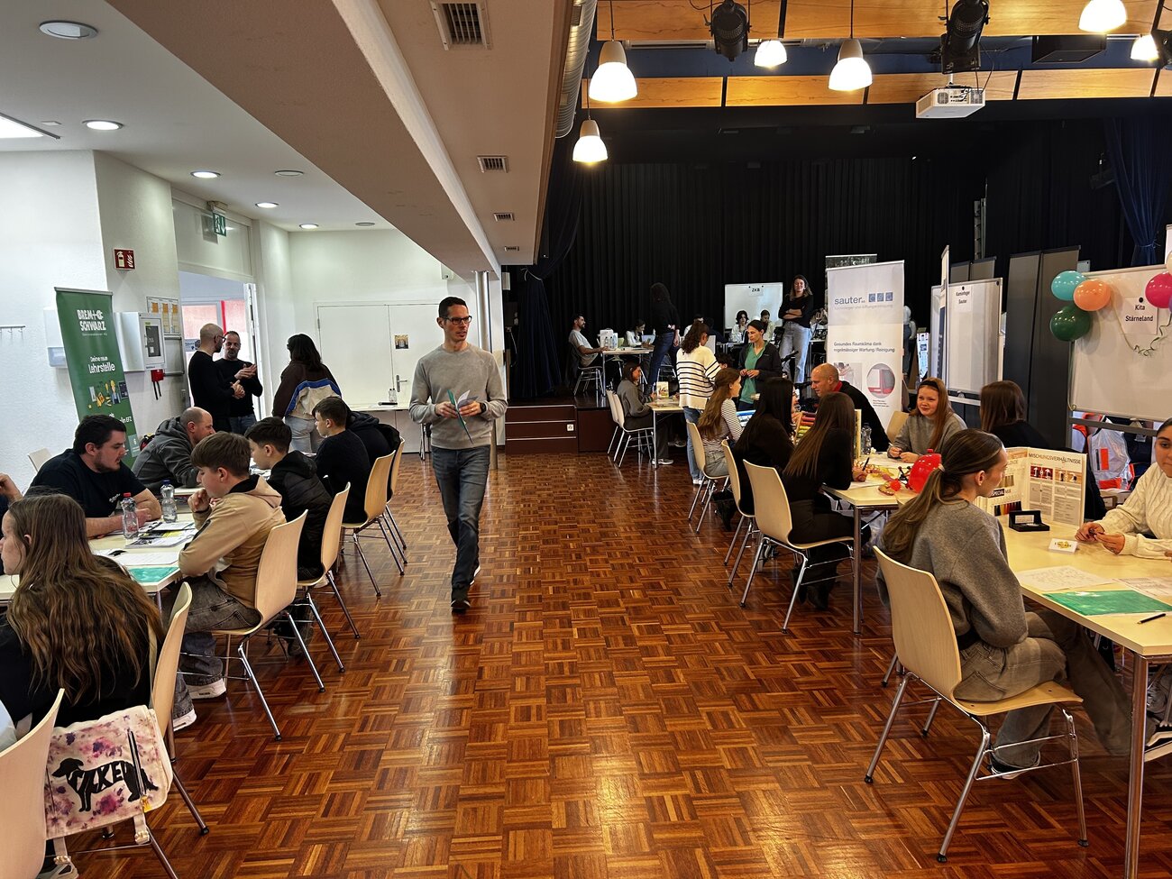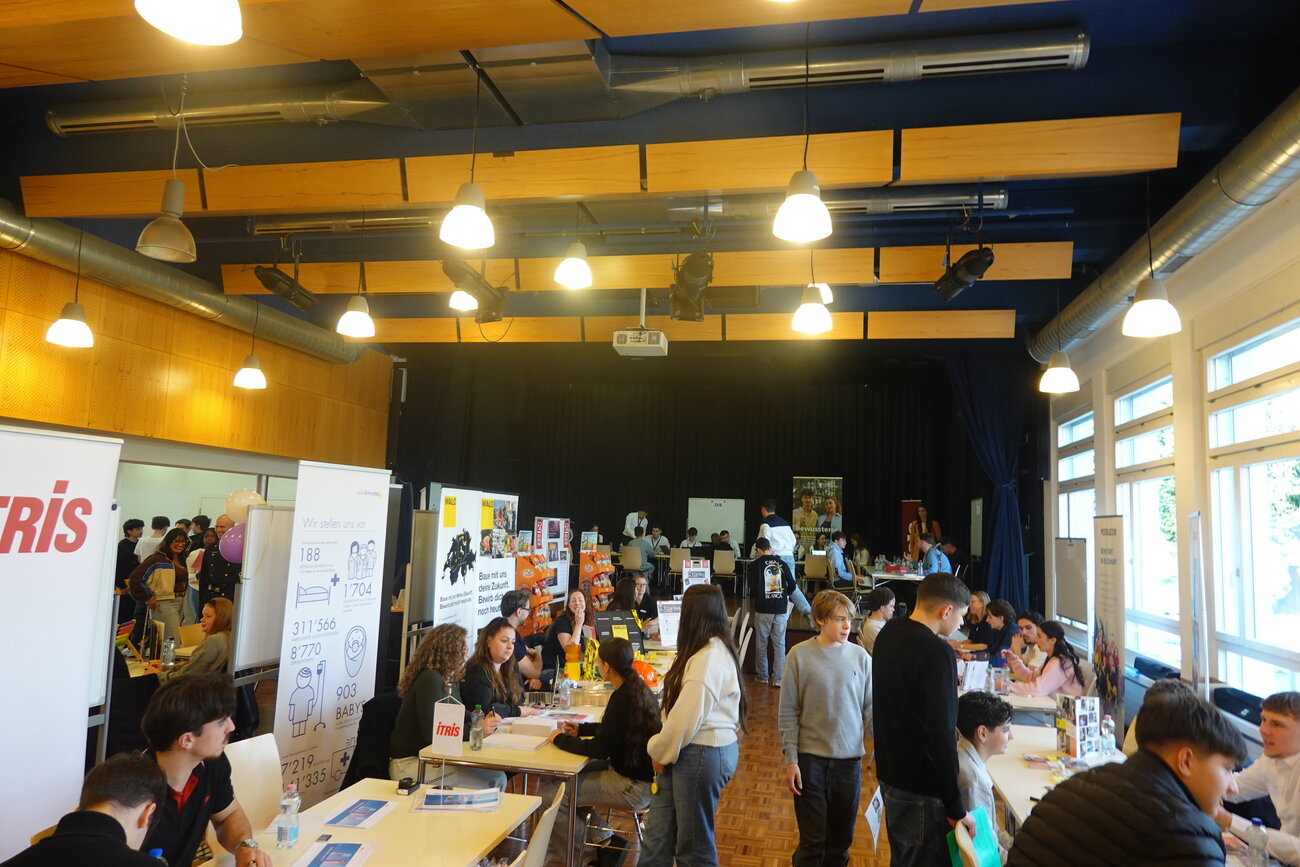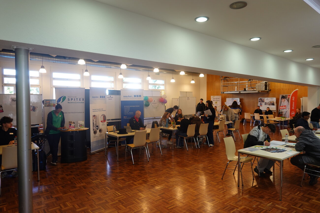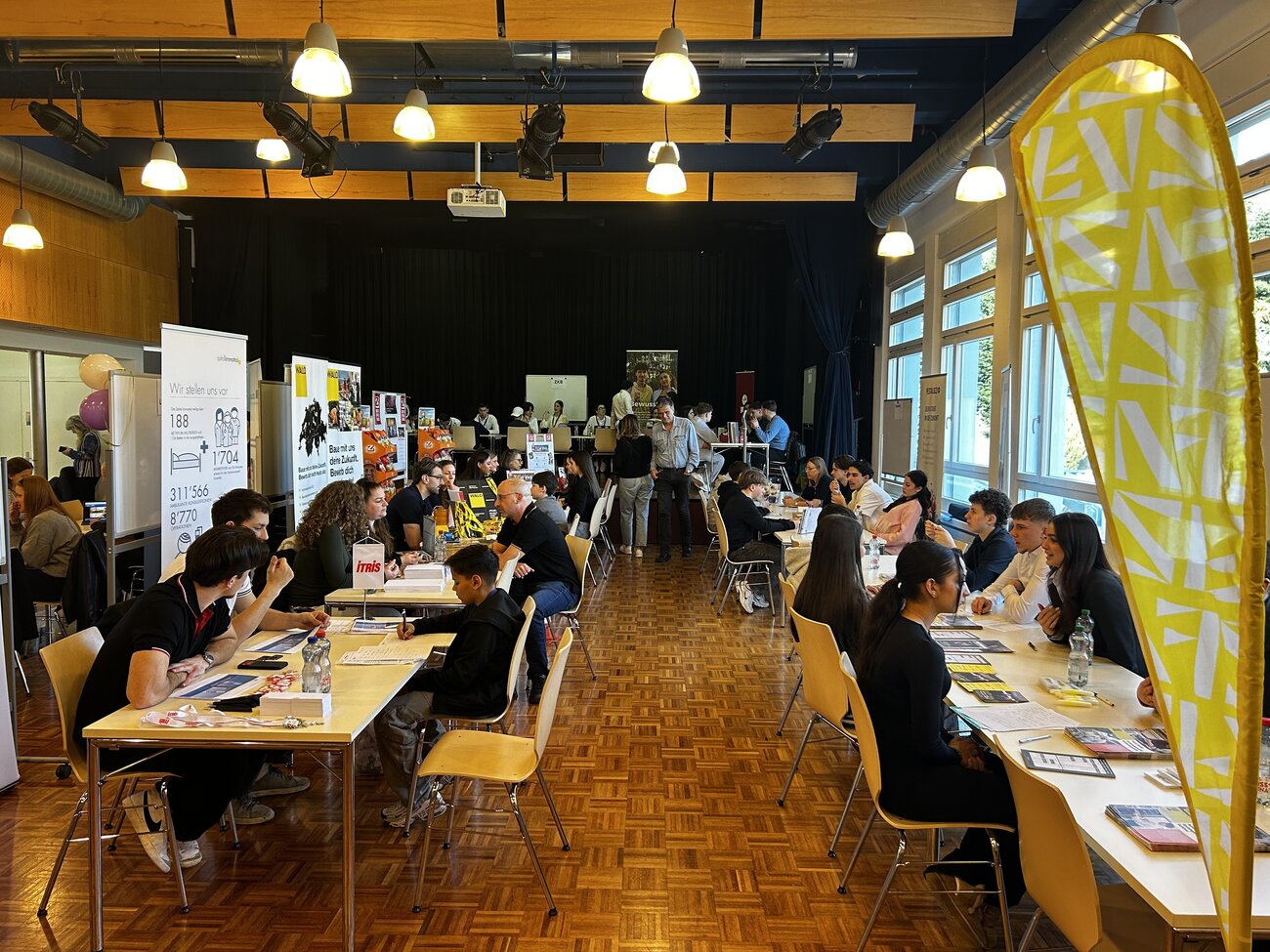Auch dieses Jahr bot die Oberstufe als besonderes Ereignis im Schuljahr eine Berufsmesse mit zwanzig Firmen aus der Region. Dabei können insbesondere die Zweitklässler, vereinzelt auch Drittklässler bei dringendem Bedarf, zu fünfundreissig verschiedenen Berufen Interviews an den einzelnen Ständen durchführen.