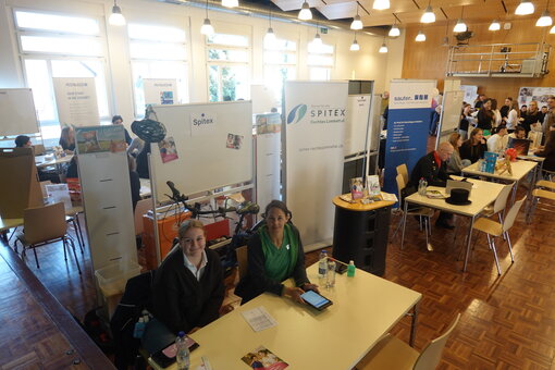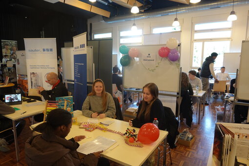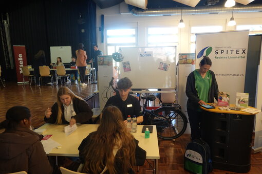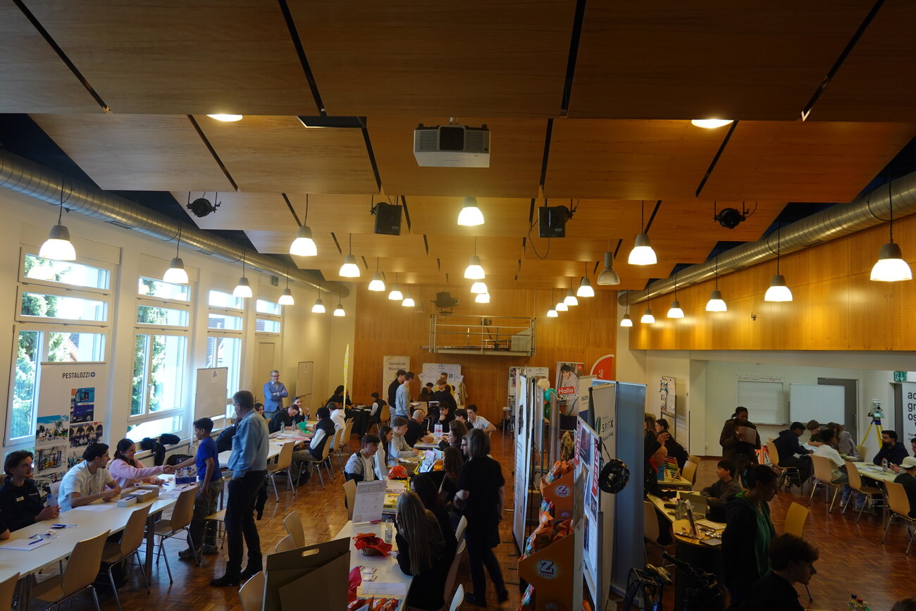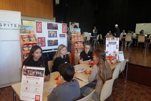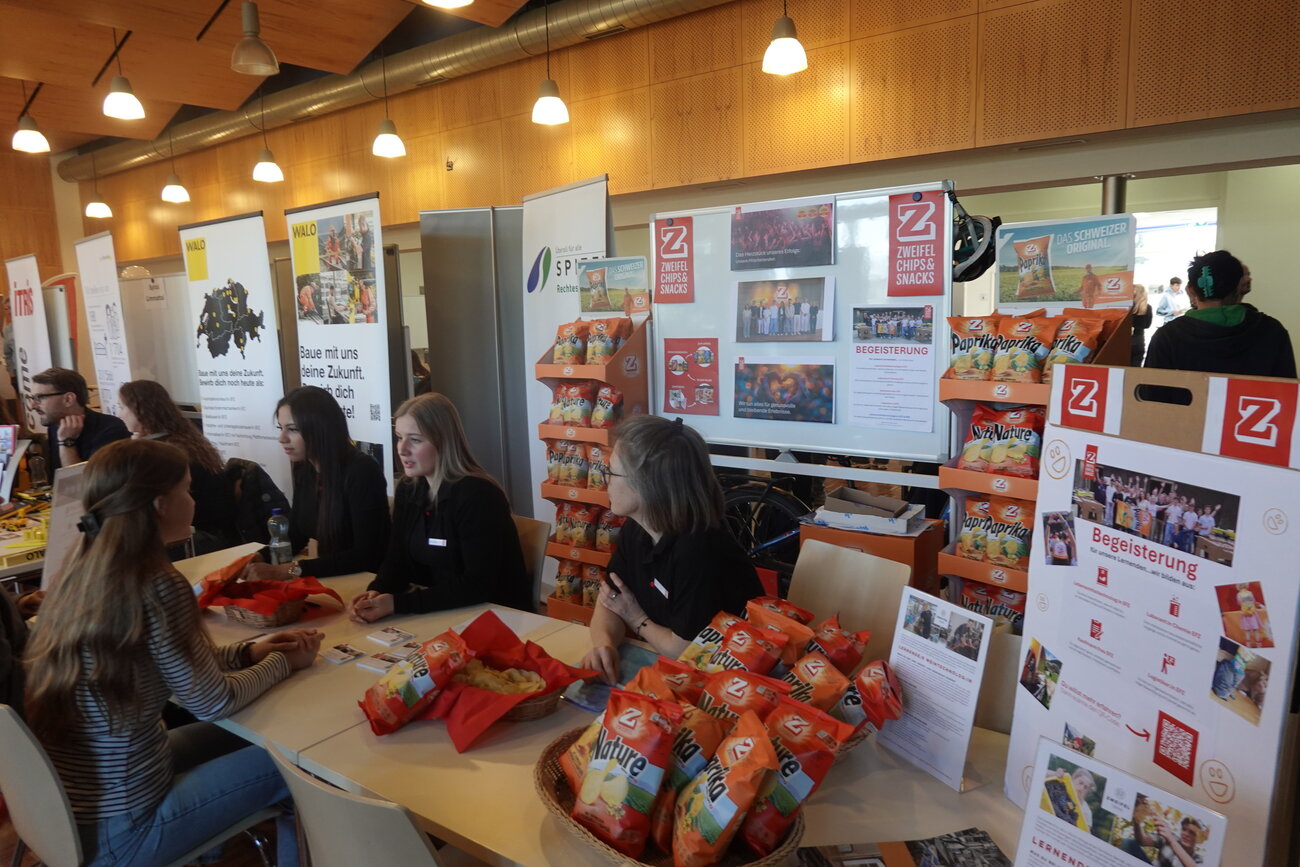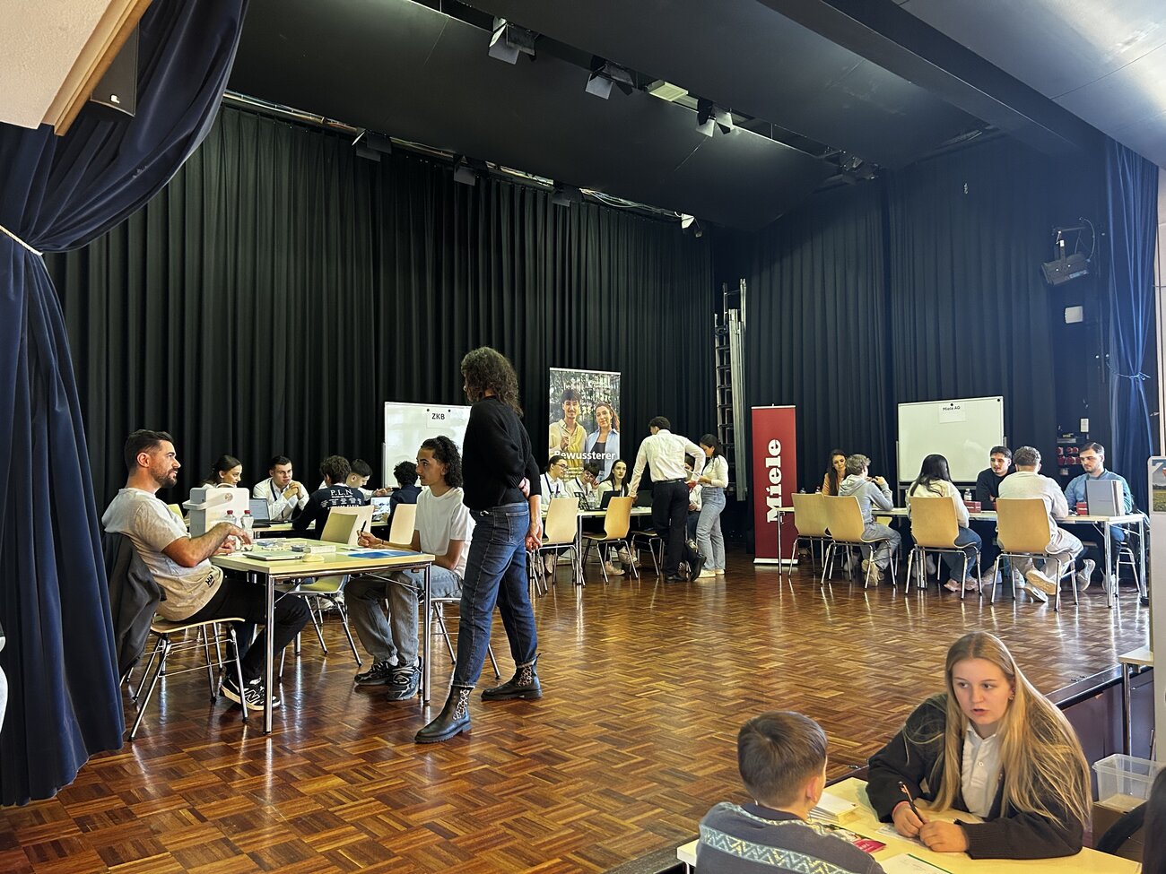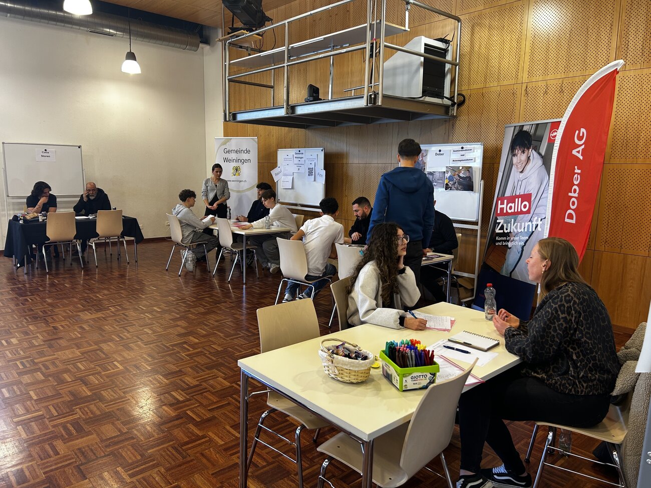 Auch dieses Jahr bot die Oberstufe als besonderes Ereignis im Schuljahr eine Berufsmesse mit zwanzig Firmen aus der Region. Dabei können insbesondere die Zweitklässler, vereinzelt auch Drittklässler bei dringendem Bedarf, zu fünfundreissig verschiedenen Berufen Interviews an den einzelnen Ständen durchführen.